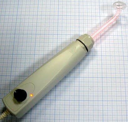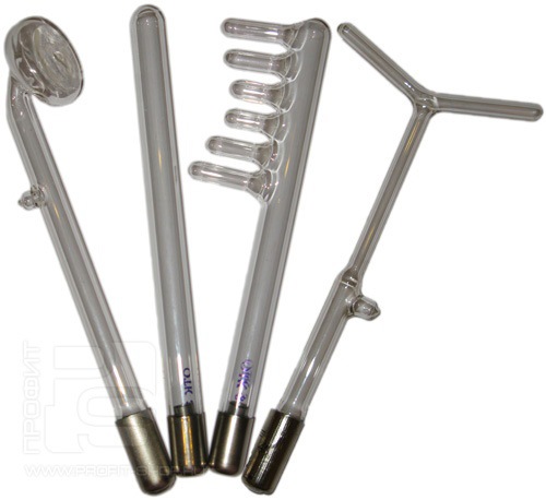 • прямой электрод предназначен для лечения внутриполостных заболеваний (наружного слухового прохода, полости носа и др.) и точечного воздействия на небольшие участки кожи (лечение небольших ранок, язвочек, угрей и т.д.);